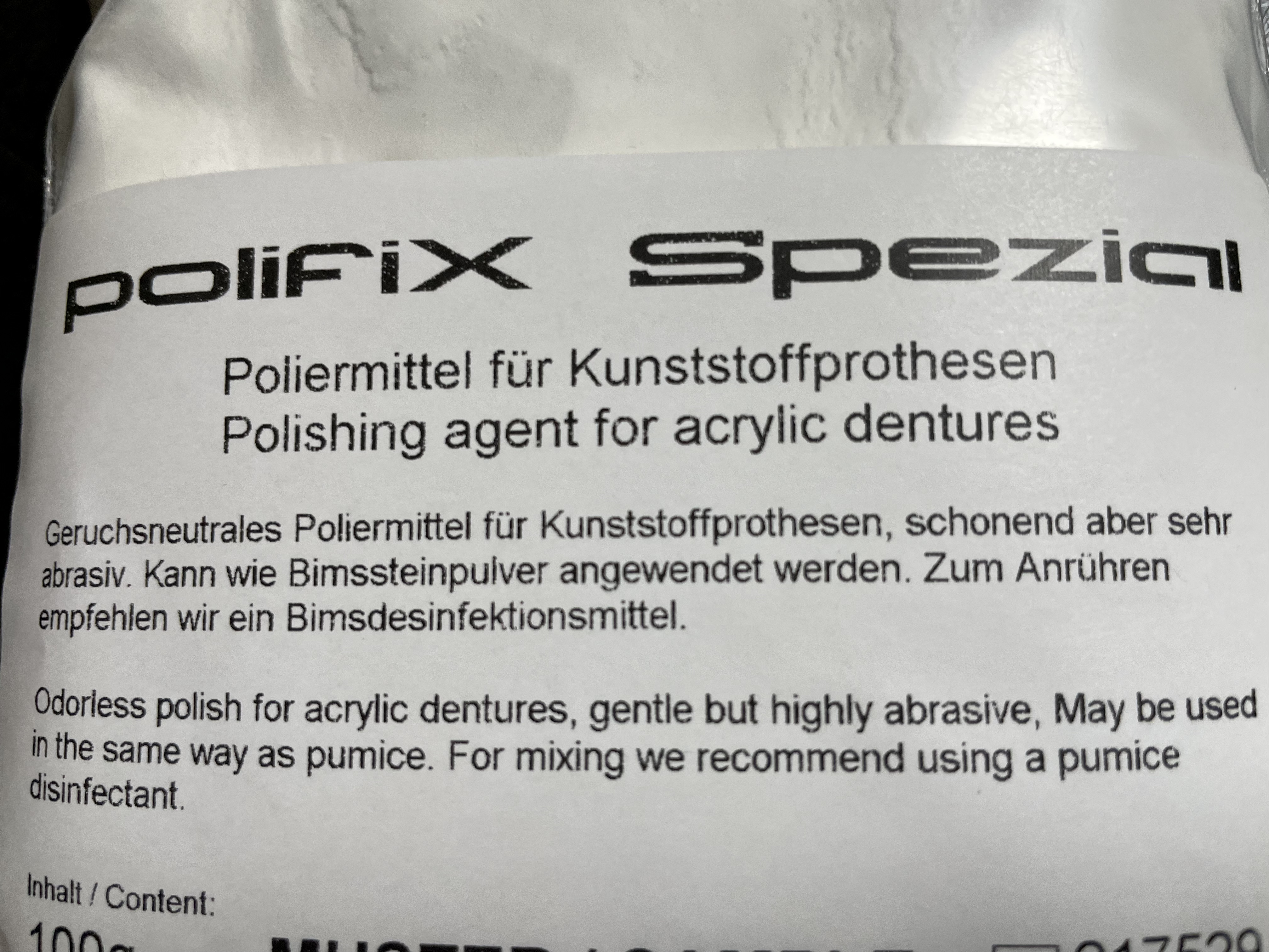 polifiX® spezial ist ein antibakterielles und geruchloses Vorpoliermittel für Kunststoff-prothesen. Verarbeitung wie mit Bimssteinpulver, jedoch ist polifiX® spezial enorm abrasiver mit einer um ca. 30% höheren Standzeit. Die einzigartige kristalline Struktur von polifiX® spezial ermöglicht eine glattere Vorpolitur der Prothesen und spart erheblichen Zeitaufwand bei der Hochglanzpolitur.